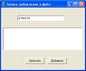 Кнопка Записать открывает файл в режиме создания нового или замещения существующего файла и записывает текст, находящийся в поле компонента Memo1. Имя файла задается в поле Edit1.