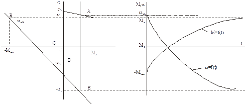 В случае активного Мс точка “B”, соответствующая установившейся скорости wс2, относится к случаю, когда этот момент в начале процесса является тормозным, что имеет место, например, при подъеме груза, а т. “c” с установившейся скоростью wс1- к случаю, когда этот момент является движущим, например, при спуске груза (рис.а).