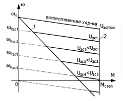 Семейство механических характеристик, соответствующих различным значениям UЗС, изображено на следующем графике. Пределы, в которых РС может поддерживать скорость постоянной, ограничены при малых нагрузках реостатной характеристикой 1 (сопротивление Rдоб не шунтировано ключом ТК), а при больших – характеристикой 2, которая определяется максимальным значением выходного напряжения регулятора РС, соответствующим его насыщению. Объясняется это тем, что в данной схеме выходное напряжение РС UЗТ является сигналом задания тока, а, следовательно, и момента.
