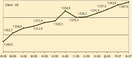 Рис. 3.1. Среднесуточная добыча нефти с газовым конденсатом в РФ (февраль 2006 г. - февраль 2007 г.) и динамика изменения цены на нефть (апрель 2006г. - апрель 2007г.)