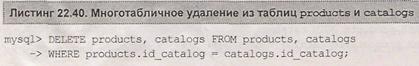 При использовании многотабличных запросов с помощью оператора delete допустимы две формы, представленные в листинге 22.39, где из таблицы products удаляются все записи, для которых имеется соответствие в таблице catalogs.