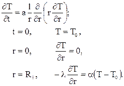 Задача связана с процессами формования термопластов и реактопластов. Многие формуемые изделия содержат в качестве элементов цилиндрические участки. Без большой погрешности можно пренебречь продольной теплопроводностью и учитывать только радиальную теплопроводность. В этом случае цилиндрический элемент можно рассматривать как бесконечный цилиндр. Представленное решение задачи одинаково правомерно для случаев нагрева или охлаждения цилиндра. На поверхности цилиндра имеет место теплообмен по закону Ньютона.