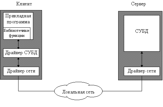 Каждая СУБД помимо интерактивной SQL-утилиты обязательно имеет библиотеку доступа и набор драйверов для различных операционных систем. Схема взаимодействия клиентского приложения с сервером базы данных в этом случае выглядит так: