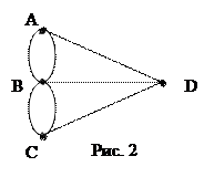 Для удобства решения составили схему или диаграмму. Части суши (оба берега и острова) обозначили точками А, В, С, D, а пути их соединяющие и проходящие по мостам, изобразим линиями, соединяющими эти точки. (Рис. 2) Такая схема содержит всю необходимую информацию о рассматриваемой ситуации и не содержит ничего лишнего. Глядя на нее, можем заключить только, что четыре объекта – А, В, С, D – попарно как-то связаны между собой ( в данном случае мостами), причем А с В и В с С соединены двойной связью, а D с каждым из объектов А, В и С – одинарной. Точки А, В, С, D – вершины, соединяющие их линии – ребра диаграммы.