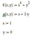 Результат: В первых двух строках вводятся функции, которые определяют систему уравнений. Затем переменным и , относительно которых она будет решаться, присваиваются начальные значения. После этого следует ключевое слово Given и два логических оператора, выражающих рассматриваемую систему уравнений. Завершает вычислительный блок функция Find, значение которой присваивается вектору . В последних двух строках осуществляется проверка правильности решения системы уравнений.