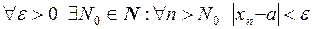 Это значит, для любой окрестности точки а существует такой номер , что все члены последовательности с номерами, большими, чем этот, принадлежат этой окрестности, т.е.