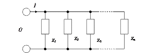 Пусть между двумя узлами электрической цепи параллельно включены ветви с комплексными проводимостями Y1 =g1-jb1, Y2=g2-jb2, … Yn=gn-jbn. Напряжение на всех ветвях одинаковое, равное (рис.5.10).