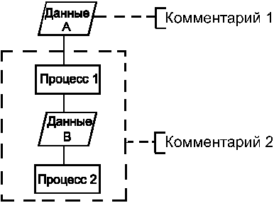 4) текст для понимания функции символа следует помещать внутри символа. Текст должен записываться слева направо и сверху вниз. Если объём текста внутри символа превышает его размеры, следует использовать символ комментария. При этом пунктирные линии в символе комментария связаны с отдельным символом или могут обводить группу символов. Текст комментариев должен быть помещен около ограничивающей фигуры. Пример иллюстрируется рисунком 2.8.