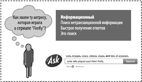 Информационные операции поиска включают в себя огромный диапазон запросов. Например: местная погода, карты и инструкции, подробности последней церемонии присуждения наград в Голливуде, либо просто выяснение вопроса о том, сколько времени занимает путешествие на Марс. Операции информационного поиска в основном не ориентированы на транзакции (хотя они могут включать поиск информации о товаре или услуге). Целью является сама информация и не требуется никакого взаимодействия между кликами и чтением. На рис. 1.3 показан пример информационного запроса.