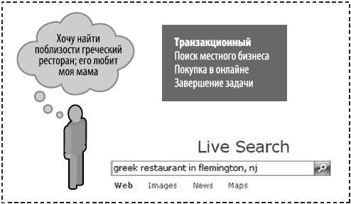 Транзакционный поиск не обязательно приводит к переводу денег с кредитной карты или телеграфным переводом. Регистрация бесплатного пробного счета на CookIllustrated.com, создание учетной записи в почте Gmail, оплата штрафа за парковку, поиск самого лучшего места с мексиканской кухней для сегодняшнего ужина – это все транзакционные запросы. На рис. 1.4 показан пример транзакционного запроса.