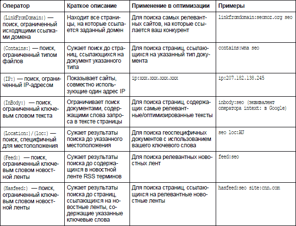 Несмотря на то, что Bing не очень широко используется для оптимизации, он тоже может помочь лучше понять проблемы вашего сайта в плане оптимизации и эффективно найти ценную информацию для оптимизации. Кроме того, Bing предлагает несколько уникальных операторов поиска, которые стоят того, чтобы их рассмотреть (табл. 2.6).