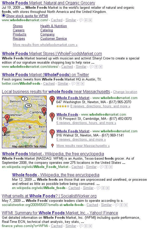 Представьте, что вы делаете поиск по имени вашего бренда в поисковом движке и в результатах поиска на высокой позиции стоит web-страница, которая очень критически отзывается о вашей организации. Посмотрите результаты поиска по словам Whole Foods на рис. 3.5.