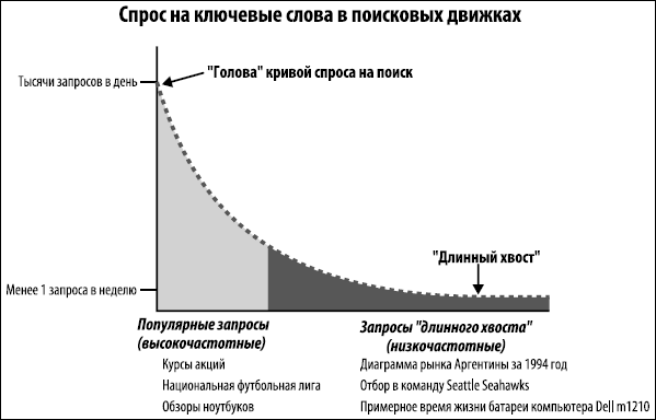 Понимать кривую спроса на поиск очень важно, поскольку она подчеркивает важность нацеленного на "длинный хвост" контента (страниц с информацией, не предназначенной ни для какого популярного запроса), который охватывает гораздо более широкий диапазон типов запросов, вводимых пользователями в поисковых движках.