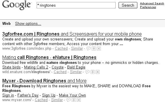 Использование поиска с символом звездочки может дать хорошее представление о том, какие термины/фразы обычно предшествуют или следуют за указанным термином/фразой. Например, при использовании * ringtones вы увидите те фразы, которые обычно ассоциируются с термином ringtones (рис. 5.4).