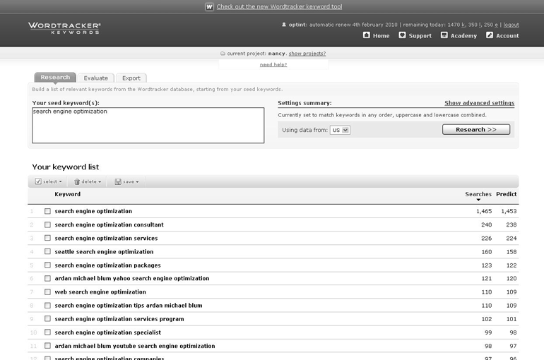 Когда вы введете ключевое слово/фразу, то увидите счетчик (инструмента Wordtracker) для общего количества выполненных по Интернету операций поиска за предыдущие 90 дней. Вы увидите также и список, в котором содержатся как указанное вами ключевое слово, так и похожие ключевые слова (с прогнозом количества поисков за день по каждому).