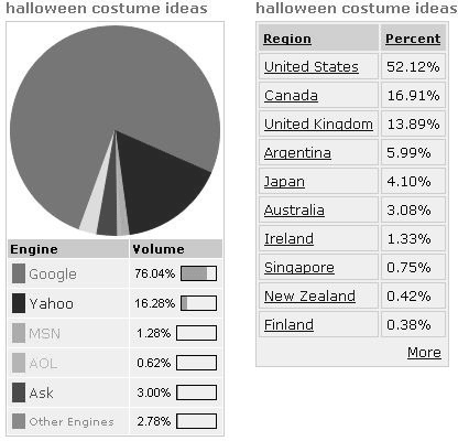 Здесь вы видите, когда люди начинают искать костюмы для Halloween и когда эта активность спадает. Если вы посмотрите ниже, то увидите получающие запросы поисковые движки и страны, из которых приходят эти запросы (рис. 5.40).