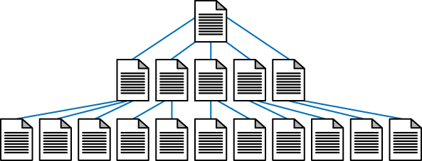 Одно из самых строгих правил дружественности к поиску – это создание плоской архитектуры сайта. Плоские сайты требуют минимального количества кликов для достижения любой заданной страницы. Глубокие же сайты создают длинные маршруты ссылок, требующихся для доступа к контенту. Почти для любого сайта размером менее 10 000 страниц весь контент должен быть доступен максимум за три клика от начальной страницы (или страницы с картой сайта). При наличии 100 ссылок на странице даже сайты с миллионами страниц могут дать доступ к любой странице максимум за пять или шесть кликов (если применяются правильные структуры ссылок и навигации). Если сайт создан не плоским, то для достижения нужного контента может понадобиться слишком много кликов (рис. 6.9). В отличие от него плоский сайт (рис. 6.10) позволяет пользователям и поисковым движкам достичь большей части контента всего несколькими кликами.