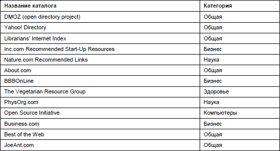 Каталоги также могут быть отличным способом получения ссылок. Есть большое количество каталогов, для включения в список которых может быть необходимо заплатить деньги. В табл. 7.1 перечислены некоторые примеры хороших каталогов.