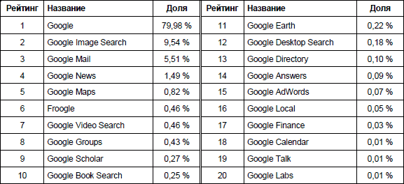 Таблица 8.1. Самые популярные активы Google (май 2006 г.)
