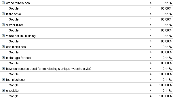 Отчет "Трафик по ключевым словам" может также показать вам низкочастотные термины. На рис. 9.3 изображен фрагмент из отчета по естественным поисковым фразам из пакета Yahoo! Web Analytics, в котором показаны некоторые из низкочастотных терминов для сайта Stone Temple Consulting (http://www.stonetemple.com).