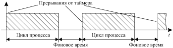 Другой вариант однопроцессной структуры управления состоит в циклическом запуске процесса по прерываниям таймера, работающего на постоянной несущей частоте (рис. 2, б). Поскольку процесс не использует полностью весь период постоянной несущей частоты, возникает фоновое время, которое может быть использовано диагностическими и другими системными задачами.