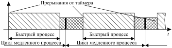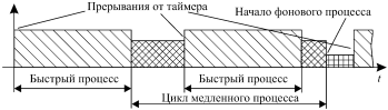 Вариант, показанный на рис. 2, в, использует двухпроцессную структуру управления следующим образом: «быстрый» циклический процесс запускается по прерываниям таймера, работающего на постоянной несущей частоте; остающееся фоновое время используется «медленным» вторым процессом, замкнутым на себя, выполняемым за время, зависящее от фонового времени и длины программы.