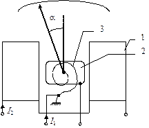 Угол отклонения стрелки пропорционален силе тока I в цепи: