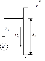 Неизвестная ЭДС EX сравнивается с известным регулируемым напряжением U0. При равенстве EX= U0 гальванометр И зафиксирует отсутствие тока. Это означает, что действие EX скомпенсировано встречным действием источника напряжения U0.