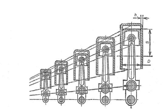 При построении параметрических, типоразмерных и конструктивных рядов машин целесообразно соблюдать механическое и термодинамическое подобие рабочего процесса, обеспечивающего равенство параметров тепловой и силовой напряженности машин в целом и их деталей. Такой подход приводит к геометрическому подобию. Например, для двигателей внутреннего сгорания действуют такие условия подобия: а) равенство среднего эффективного давления ре, зависящего от давления и температуры топливной смеси на всасывании; б) равенство средней скорости поршня vп = S n/30 ( S- ход поршня; n- частота вращения двигателя) или равенство произведения D*n, где D- диаметр цилиндра. На основании теории подобия можно перейти от тепловых и силовых параметров двигателя к его геометрическим параметрам. Тогда, главным параметром будет D(рис. 2.1), что даёт возможность создать ряд геометрически подобных двигателей с соотношением S / D= const, в которых будут соблюдаться, указанные термодинамический и механический критерии подобия рабочего процесса. При этом у всех геометрически подобных двигателей будут одинаковые коэффициенты полезного действия, расход топлива, тепловая и силовая напряженность и мощность. Градация толщины стенки цилиндра hи диаметра Dв рядах будет одинаковой.