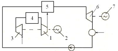 Парогазовые установки. Отработанные газы ГТУ имеют высокую температуру, что и снижает кпд термодинамического цикла. Повысить экономичность установки можно, используя парогазовый цикл. ПГУ представляют собой технологическое соединение паротурбинной и газотурбинной установок, объединенных общим тепловым циклом (рие.1.16). Газовая турбина 1 обеспечивает работу генератора 2. Рабочее тело подается в турбину компрессором 3 через камеру сгорания 4. Отработавший в ГТУ газ с достаточно высокой температурой поступает в топку парового котла 5, вытесняя соответствующее количество сжигаемого топлива. Котел снабжает паром паровую турбину 6, обеспечивающую работу генератора 7. Из турбины конденсат возвращается в паровой котел. В такой схеме используется низконапорный котел с давлением газа в топке около 0,1 МПа, что лишь немного повышает кпд цикла в целом. Используя схемы ПГУ с высоконапорным котлом (давление до 1,0 МПа), можно получить кпд 42...43%. Такие системы предполагается широко использовать в ближайшие годы [3]: до 2000 года планируется вводить на новых и реконструируемых ТЭС мощности ПГУ по 1,0 млн кВт в год, а после 2000 года - по 2 млн кВт в год, Всего за 15 лет должно быть введено 20…25 млн кВт мощности ЛГУ, что увеличит потребность в газе на 72...74 млн т.у.т.