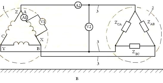 На рис.2.1б приборы А1, V1, V2 регистрируют фазные величины, а А2, V3- линейные. На рис.2.1в приборы А1, V1 регистрируют фазные величины, а А2, V2- линейные.