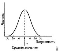 Частотное распределение серии измерений показывает отклонения, т.е. погрешности, результатов измерений от среднего значения. Частотное распределение обычно отображается в виде, показанном на Рис. 3.3. Эта форма представления называется нормальным распределением Гаусса. Такое распределение показывает, что наиболее часто встречающееся значение измеряемой величины, у которого нет погрешности измерения, и есть среднее значение; что малая погрешность имеет большую вероятность, чем большая; и что вероятность получить результат измерения больше среднего значения на заданную величину погрешности равна вероятности получения результата меньше среднего значения на такую же величину погрешности.