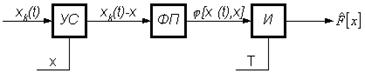 Обобщенная схема реализации алгоритма (5.42) показана на рис.5.18. Здесь: УС устройство сравнения, работающее в режиме вычитателя, формирующего сигнал xk(t)-x; ФП – функциональный преобразователь, реализующий функцию j[ xk(t),x], И – интегратор, Т- время наблюдения.