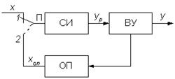 С помощью средства измерений СИ при положении 1 переключателя П производится измерение входной величины, при положении 2 - измерение выходного сигнала xоп точного обратного преобразователя ОП. Вычислительное устройство ВУ служит для запоминания результатов промежуточных измерений, для вычисления поправок и коррекции результатов. Обратный преобразователь ОП должен иметь линейную функцию преобразования xоп=Kопy при обязательном соблюдении условия