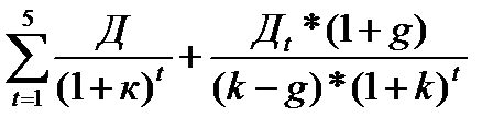 −дисконтированная отдача, которую получит акционер за 5 лет. Предприятие продолжит работать бесконечно долгий период в будущем, но дивиденды спрогнозировать на этот период практически невозможно. Поэтому рассчитывается т.н. постпрогнозная стоимость на основе бесконечных временных рядов, т.е. считается, что дивиденды стабильны и будут расти этим темпом в будущем. .