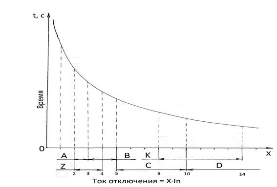 На изображение приведена условная зависимость тока КЗ от времени. На горизонтальной оси отложены целые числа, которые являются кратными номинальному току (In). Автоматический выключатель посредством электромагнитного расцепителя произведёт автоматическое размыкание контактов в заданной зоне (ниже приводятся пределы, в которых происходит отключение, при различных защитных характеристиках).