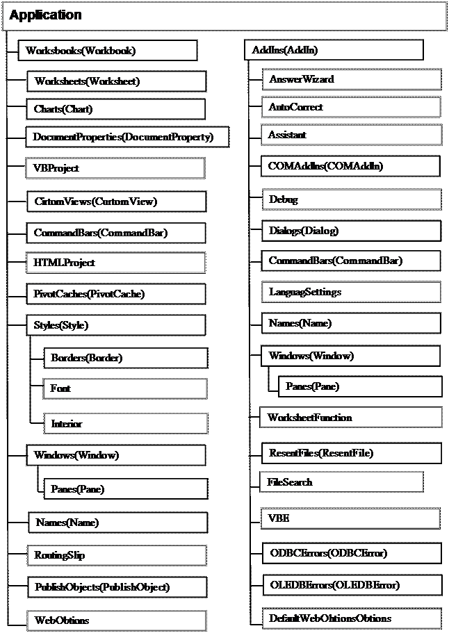 Объектная модель MS Excel представляет собой иерархию объектов, подчинённых одному объекту Application, который соответствует самому приложению MS Excel. Многие из этих объектов собраны в библиотеке объектов MS Excel, но некоторые из них, например объект Assistant, входят в библиотеку объектов MS Office, являющейся общей для всех офисных приложений. На следующих схемах представлены основные компоненты объектной модели MS Excel (здесь имена единичных объектов находятся в прямоугольниках с двойным обрамлением; имена объектов из семейств – помещены в скобки после имени семейства).