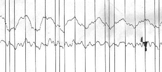 Определение причины вибрации может осуществляться по характеру колебаний. На рис. 7 показана запись вибрации нормально работающего оборудования. По вертикальной оси откладывалось виброперемещение системы, по горизонтальной – время (расстояние между двумя вертикальными одиночно стоящими полосами – 0,2с). На диаграмме видно характерная для сложных технических систем форма колебаний, состоящая из сложения колебаний нескольких независимых источников, наибольший из которых имеет частоту »12Гц. При возникшем дефекте на этом же оборудовании появляется ярко выраженная вибрационная составляющая дефектного элемента, имеющая частоту »2Гц (Рис.8).