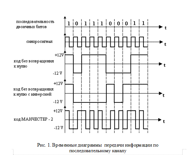 При последовательной форме передача данных осуществляется всего по одному каналу, хотя общее число каналов может быть и больше. В этом случае по дополнительным каналам передаются сигналы синхронизации и управления. Примеры передачи данных по последовательному каналу при использовании различных кодов для двоичных последовательностей приведены на рис. 6.1.