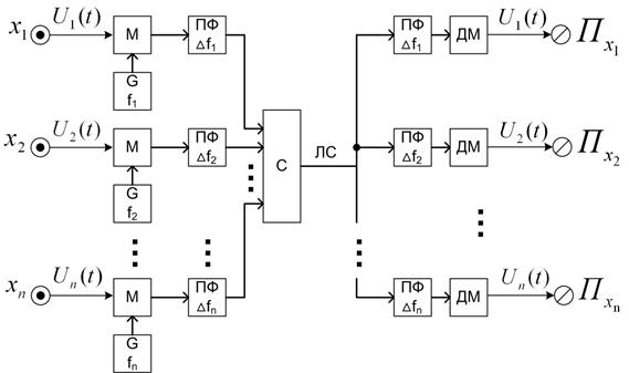 Низкочастотные сигналы Uk(t) от источников сигнала (датчиков) Xk модулируют по амплитуде или частоте высокочастотные сигналы с несущими частотами f1, f2, …, fn в модуляторах. Сигналы на выходе модуляторов имеют спектры Δf1, Δf2, …, Δfn, положение которых на шкале частот определяется несущими частотами f1, f2, …, fn, а ширина зависит от ширины спектра сигналов датчиков. Полосовые фильтры передающей части ограничивают полосы частот своих каналов. В смесителе все сигналы смешиваются и поступают в линию связи. На приемной стороне сигнал с линии связи поступает на полосовые фильтры, каждый из которых имеет полосу пропускания, равную полосе фильтра на передающей стороне. Сигнал с выхода фильтра демодулируется демодулятором. На выходе демодулятора получаем сигнал Uk, переданный с датчика. Сигнал Uk поступает приемнику.