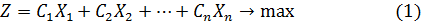 2. определение оптимального плана задачи, то есть отыскание экстремальных значений (минимума и максимума) целевой функции. Условием оптимальности при определении максимального значения целевой функции является отсутствие отрицательных коэффициентов в Z –ой строке таблицы (6), кроме свободного члена Q.