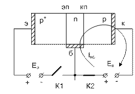 p-n переходу прикладывается напряжение Еэ в прямом (пропускном) направлении, а к коллекторному p-n переходу прикладывается напряжение Екв обратном направлении.