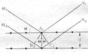 Если направить на атомы, образующие кристалле ряд с периодом B, два луча M1A1N1 и M2A2N2, в случае происхождения дифракции, ломаная M1A1N1должна быть больше M2A2N2 на целое число длин волн,
