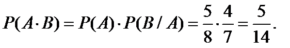 Пусть событие − появление белого шара при первом вынимании, − появление белого шара при втором вынимании. Учитывая, что , (вероятность появления второго белого шара при условии, что первый вынутый шар был белым и его не возвратили в ящик). Так как события и зависимые, то вероятность их произведения найдем по формуле (3.15):