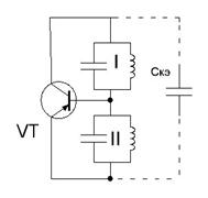 Для схемы рис.3а настройка контуров I и II должны быть такой, чтобы их сопротивления было индуктивными; в этом случае реализуется схема индуктивной трехточки. Для схем рис.3б и 3в настройки контуров I и II должны быть такими, чтобы сопротивление контура I было индуктивным, а сопротивление контура II–емкостным; в этом случае реализуется схема АГ по емкостной трехточки. В таких схемах паразитные параметры транзистора Скб , Сбэ , Скэ участвуют в работе как полноправные элементы схемы; при этом конструктивно сами конденсаторы в схеме АГ могут отсутствовать.