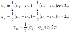 Если ввести новую систему координат , повернутую относительно прежней на угол a (см. рис.10.7), то в ней напряжения запишутся так: