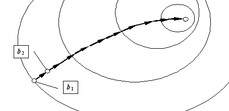 Если задана начальная точка b1, то переход в точку b2 производится по направлению противоположному направлению градиента (в точке b1), которое можно вычислить аналитически или численно. Задача состоит в определении частных производных и формировании вектора смещений по осям D(X)=Dx1, Dx2,..., Dxn пропорционально их величине, b2=b1+D(X). Повторяя данную процедуру, можно придти в точку минимума по кратчайшему пути (рис. 3.10).
