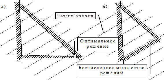 Поверхность целевой функции представляет собой n-мерную плоскость. Если допустимая область изменения управляемых переменных выпукла, то оптимальное решение с очевидностью совпадает с одной из вершин допустимой области (рис. 3.13.а) или, если одна из границ допустимой области параллельна линиям уровня (рис. 3.13.б), задача имеет бесчисленное множество таких решений (выбрать можно любое из них).