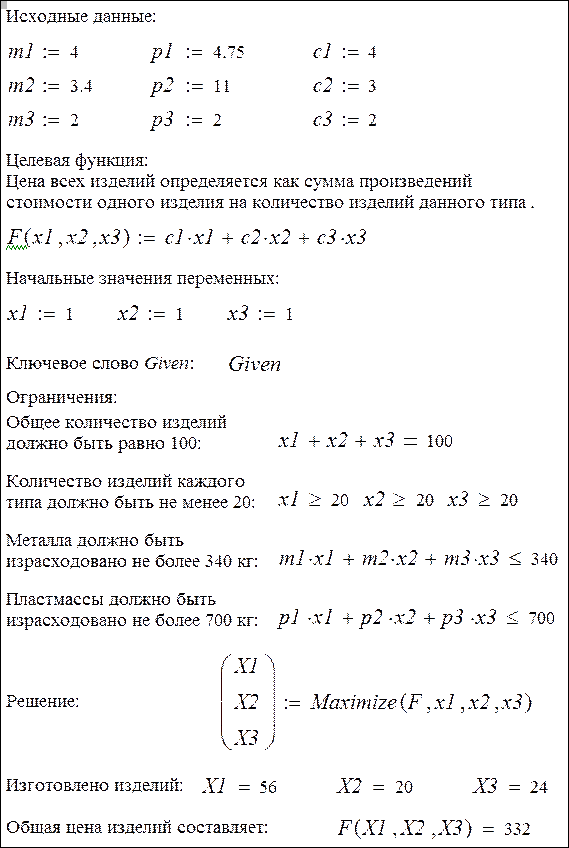 Задача сводится к вычислению максимума функции [3]. Решение задачи в системе MathCad приведено на рис. 3.15. Математическое решение очень логично – самых ресурсоемких изделий 2 типа выпускается минимальное число, самых дорогих изделий 1 типа – максимальное, остаток ресурсов расходуется на изготовление дешевых изделий 3 типа.