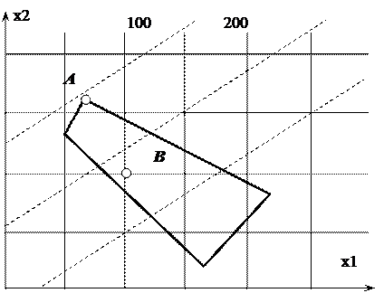 При округлении координат точки А (рис. 3.16), которая является решением задачи без учета требований целочисленности, получается недопустимое решение. Оптимальной является точка В, а не ближайшие к точке А узлы сетки с целочисленными координатами.